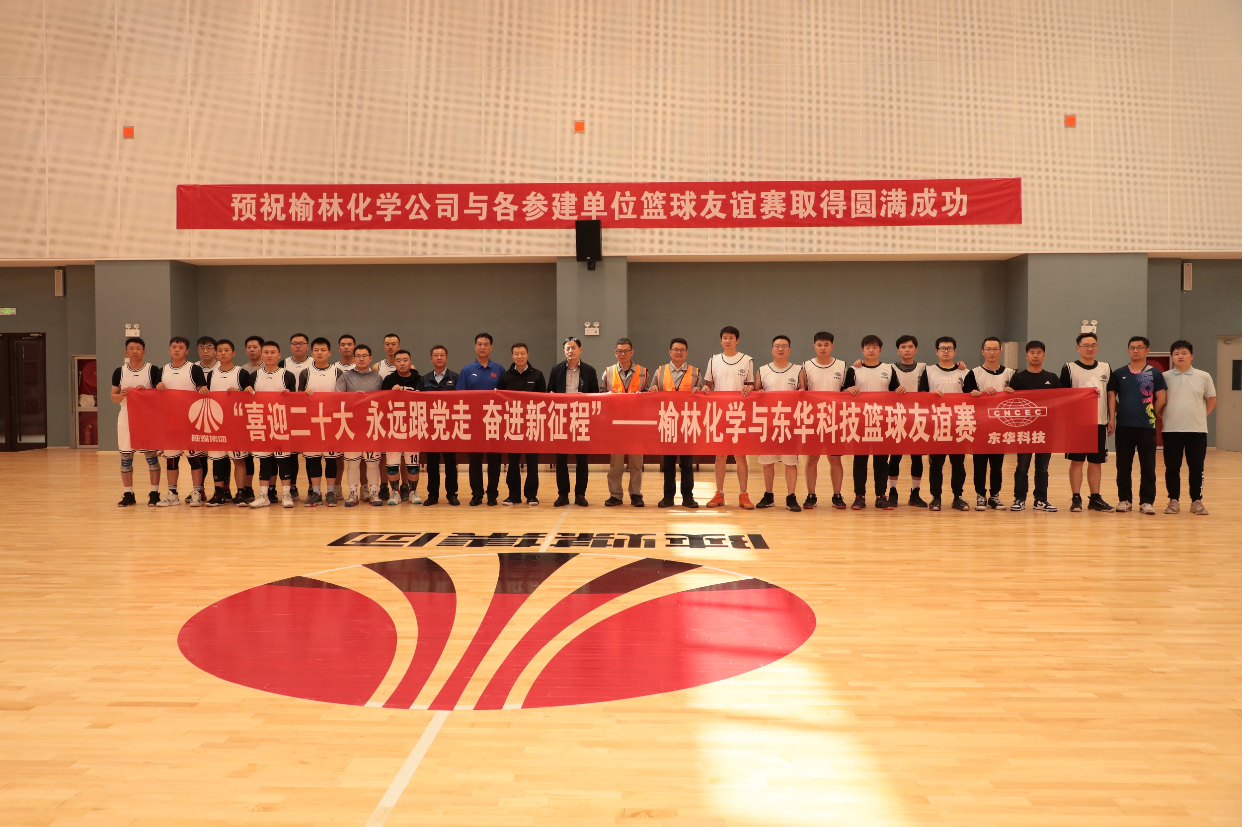 5月11日下午,华体官方网页版_华体(中国)与陕煤集团榆林化学有限责任公司(以下简称“榆林化学”)组织开展了主题为“喜迎二十大,永远跟党走,奋进新征程”的篮球友谊赛。榆林化学党委委员、纪委书记樊曹武,总工程师刘万胜莅临现场观看比赛,并与双方运动员合影留念。